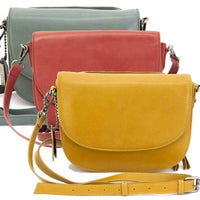 The Cameleon Sophia is a 100% leather saddle bag adjustable crossbody with an accordion design. It features a half flap front with hidden magnetic snap closure. The structured main compartment is spacious with a deep, open pocket on one side.