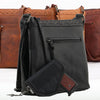 Underneath the front flap, secured with strong snaps, is an organizer with an ID holder, 3 credit card slots, an open slit pocket for bills or cell phone and two zippered coin pockets with RFID protection.